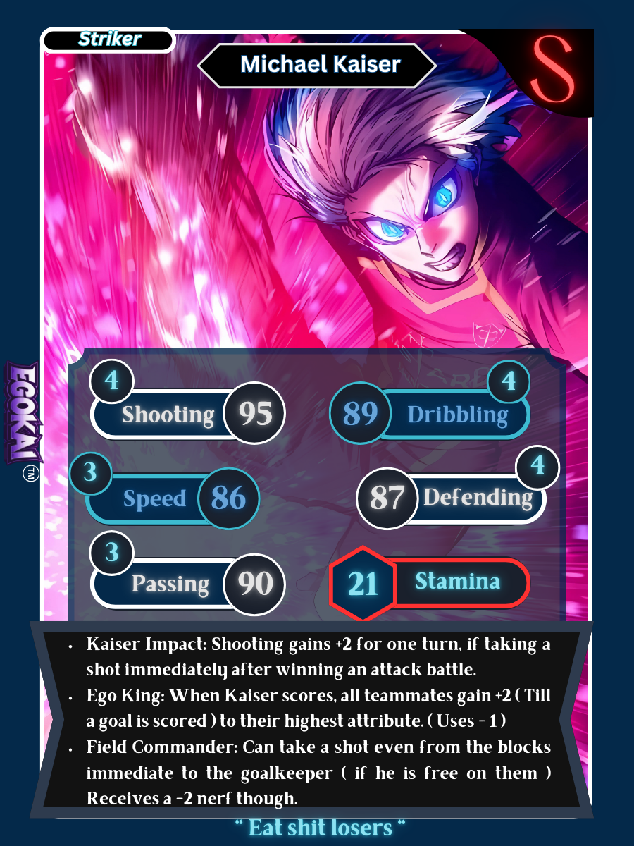 Team Ego — the battle boosters of Blue Lock. These cards don’t just join the fight — they rewrite it. Synergy effects, signature moves, and ruthless rivalries turn the pitch into a warzone where momentum bends to your will. Every pull is a loaded weapon, capable of chaining chaos or crushing an opponent’s ego in one strike. This pack doesn’t build strikers — it forges the tricks, traps, and tactics that make victory inevitable. Cold. Unfair. Unstoppable.